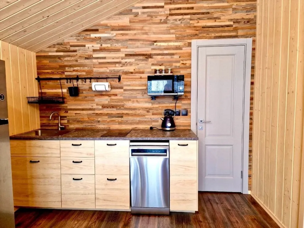 - Кухня-гостиная с диваном и креслом, оснащена варочной поверхностью, посудомоечной машиной, микроволновкой, холодильником, эл. чайником и всей необходимой посудой.