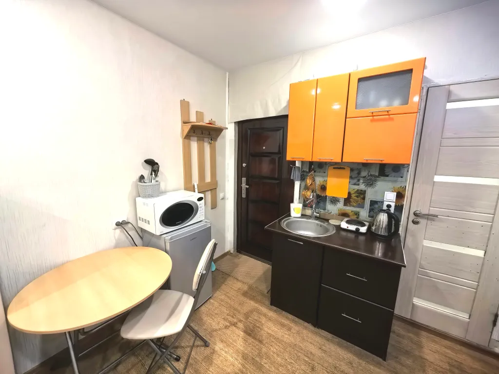 На кухне необходимый набор посуды для приготовления и приёма пищи.
