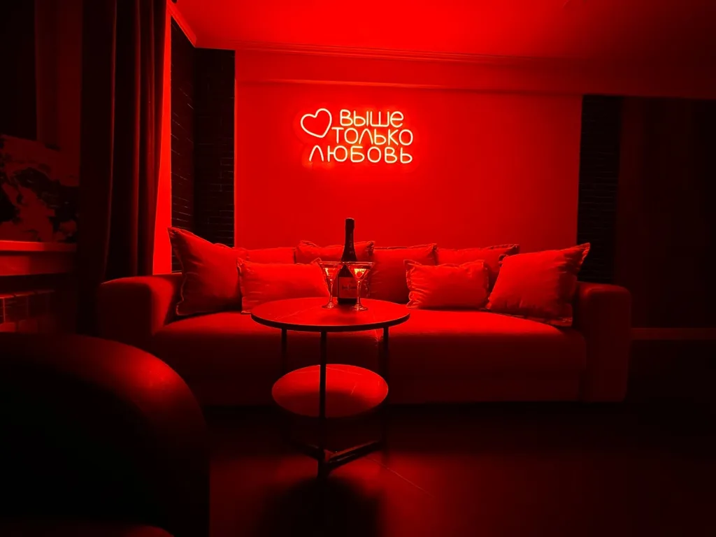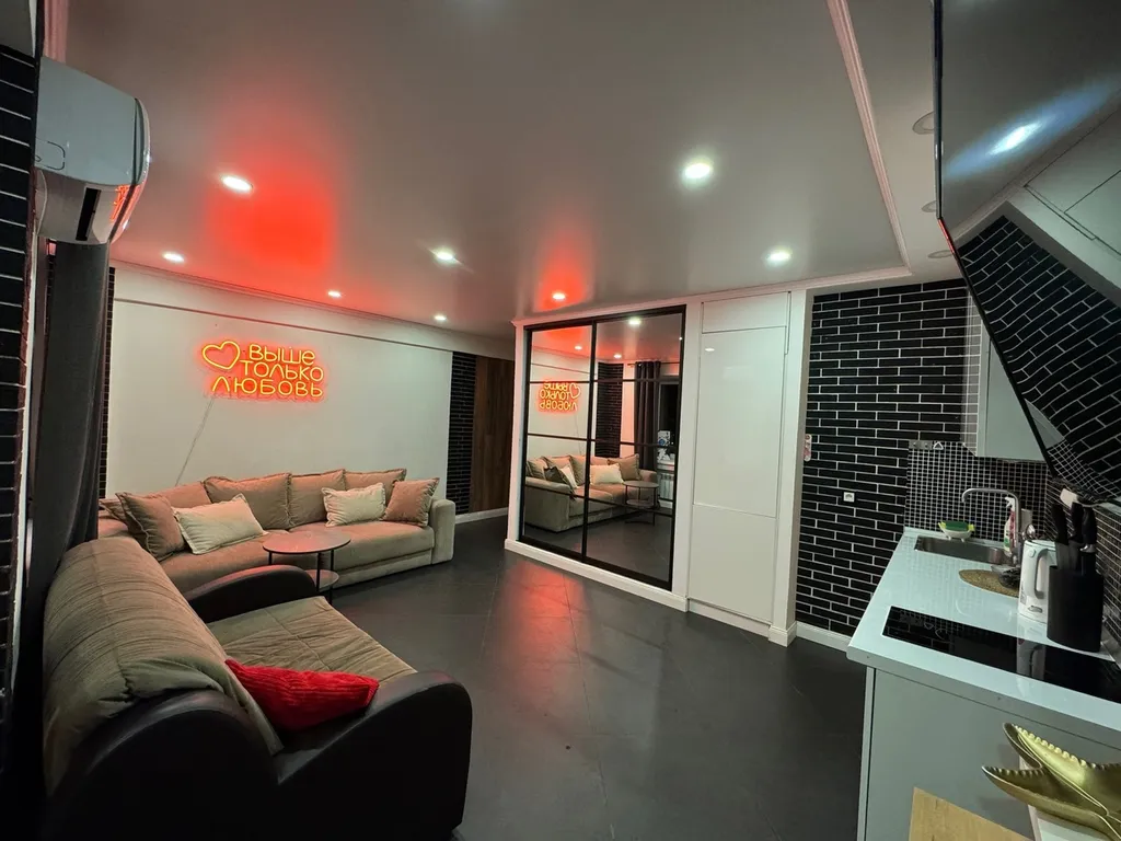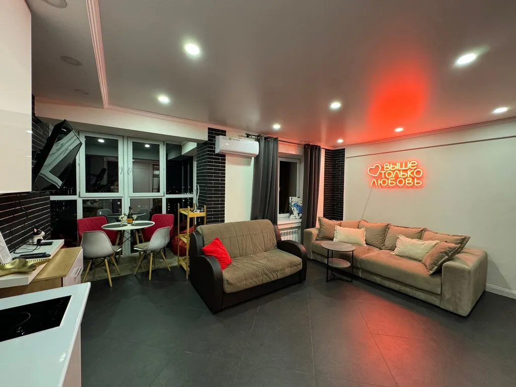Квартира находится в новом доме и отличается качественным и современным ремонтом. Она полностью оборудована всем необходимым для комфортного проживания: два удобных дивана Moon с независимыми пружинными блоками размером 2х160 и 2х130 см, смарт-ТВ, стиральная машина, микроволновая печь, эл. чайник, фен, утюг и пр. Стильная неоновая вывеска для ваших фото.