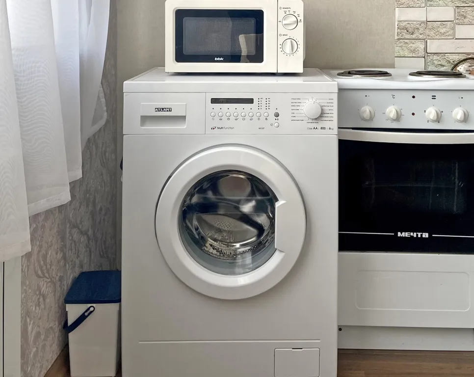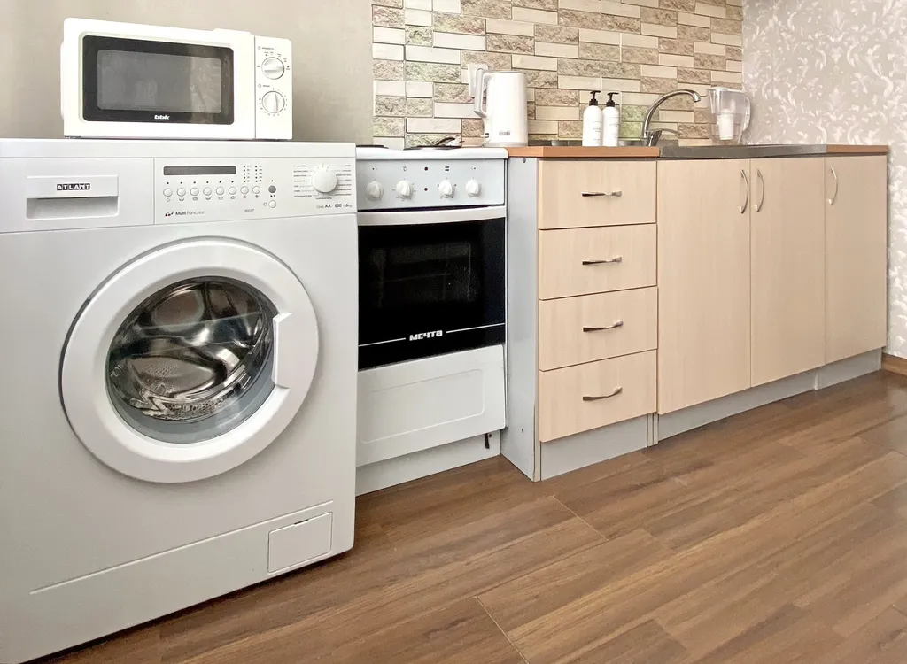 Кухня: холодильник, плита, духовка, микроволновка, стиральная машина, чайник, необходимая посуда