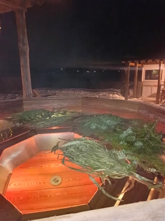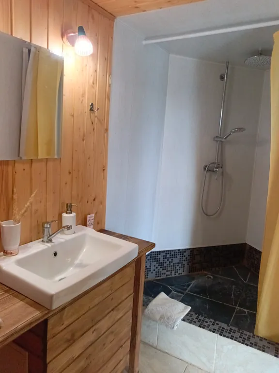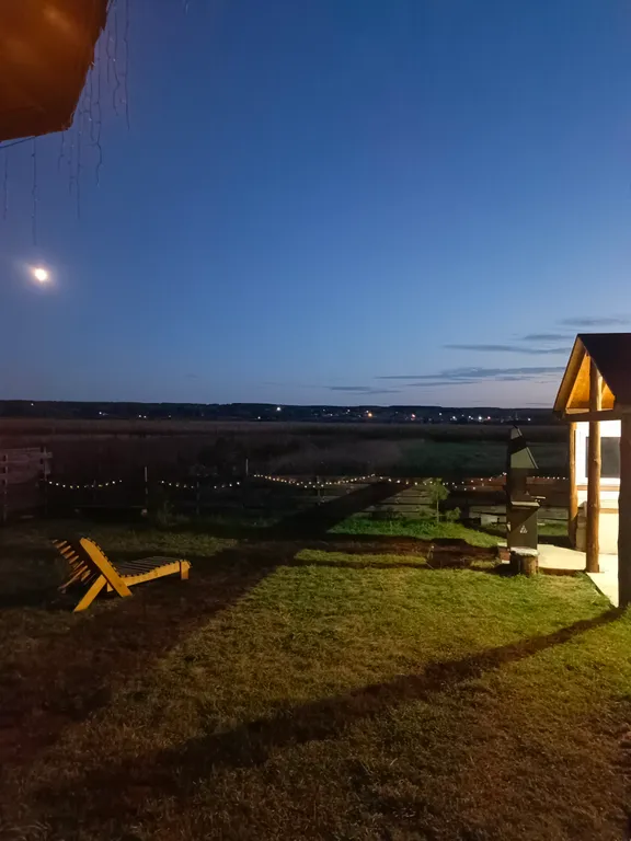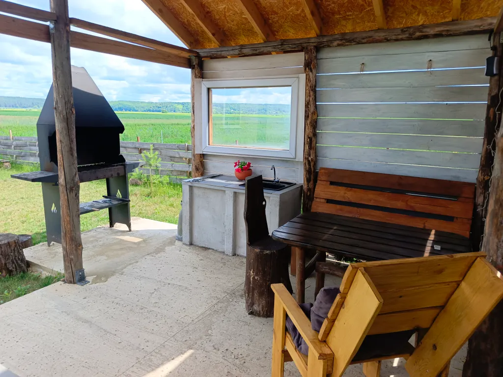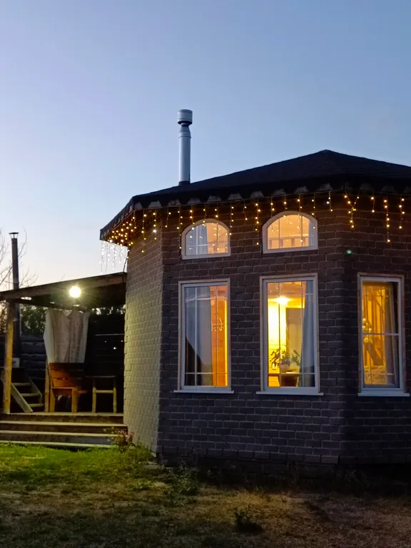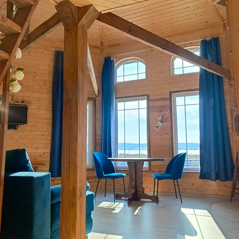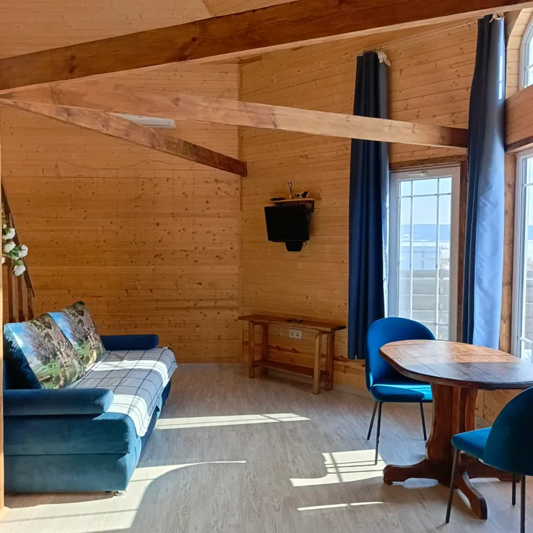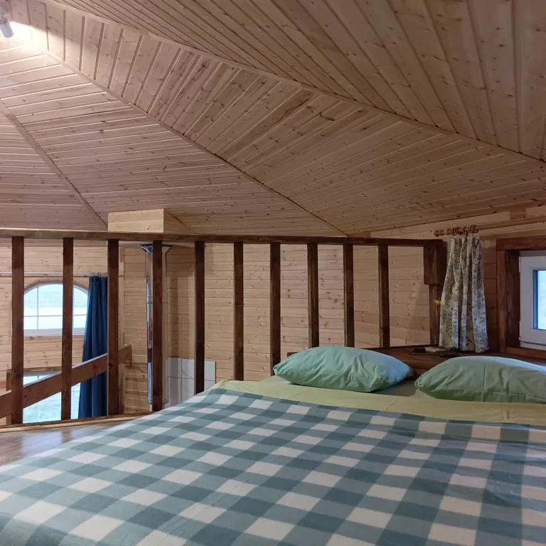 В доме два яруса, на нижнем раскладной диван, на верхнем - двухспальная кровать.