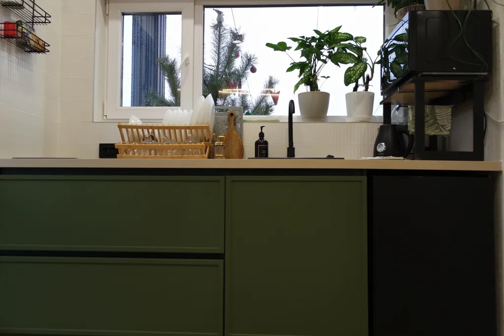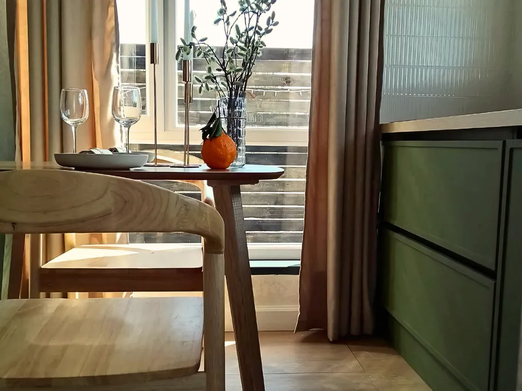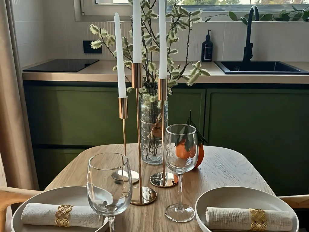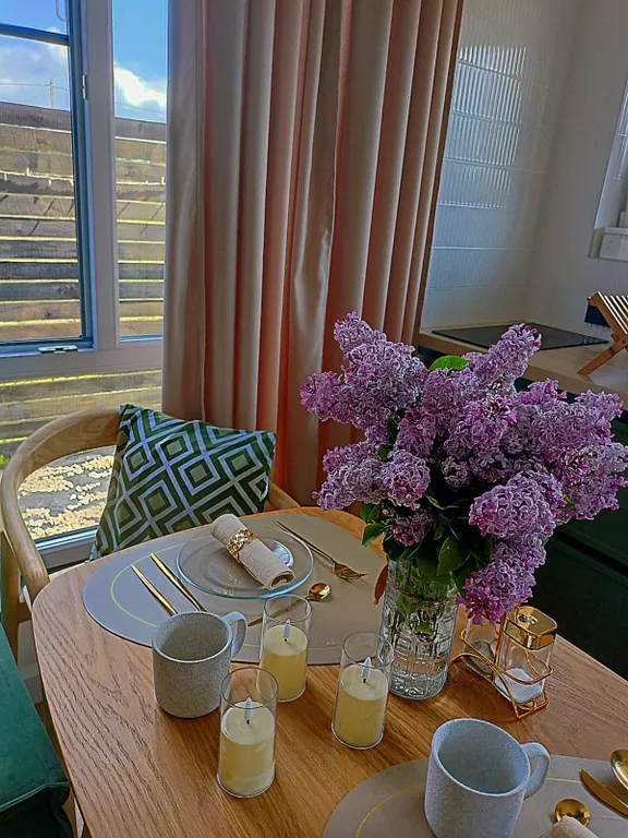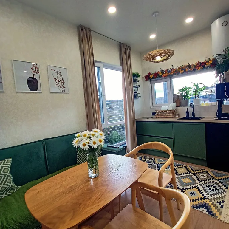 Уютная кухня, оснащенная холодильником, электроплитой, чайником, печью СВЧ и всей необходимой посудой, обеденный стол.