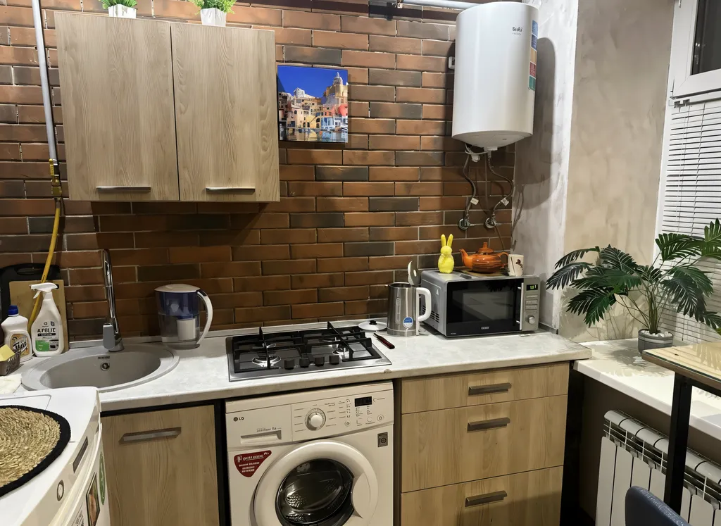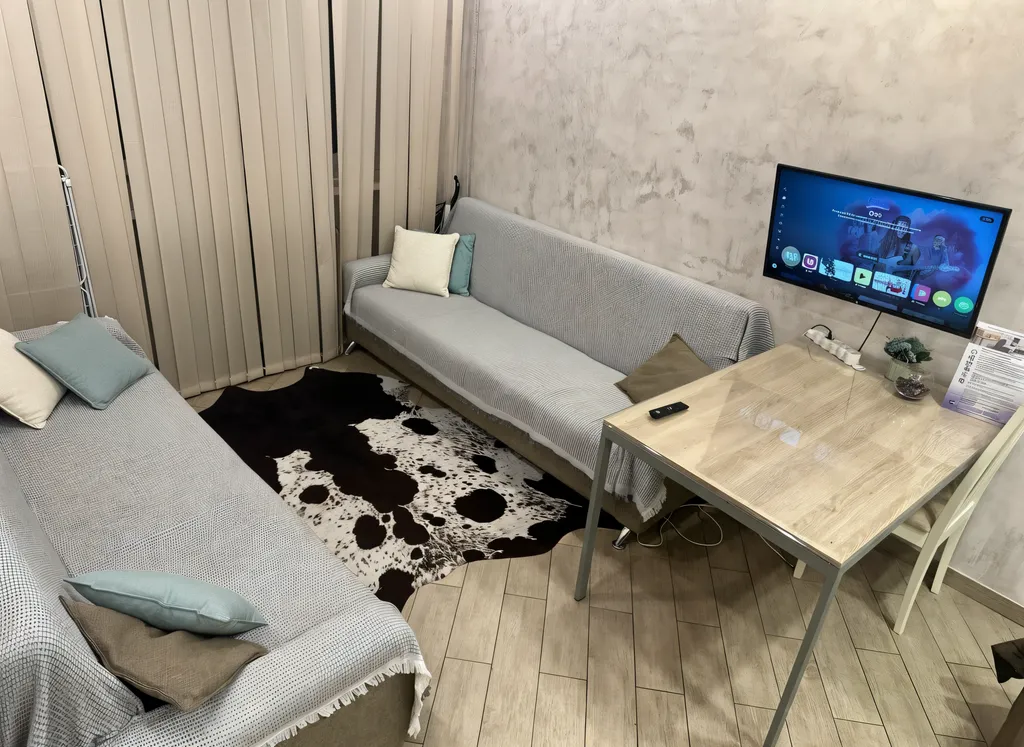 Квартира идеально готова для проживания: три отдельных спальных места (двухспальная кровать и два дивана), оснащена необходимой бытовой техникой (смарт-телевизор, стиральная машина, холодильник, микроволновая печь, чайник, утюг, фен и др.).