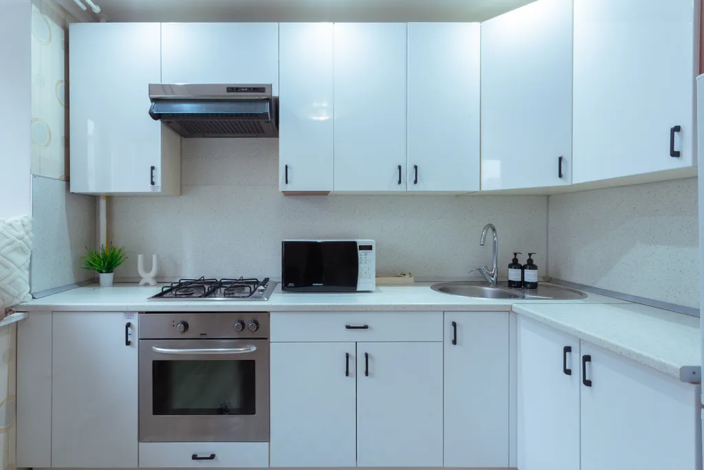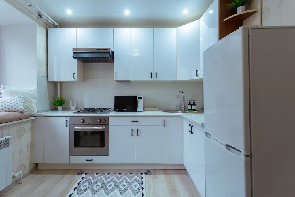 Кухня: холодильник, плита, микроволновка, чайник, духовка, необходимая посуда.