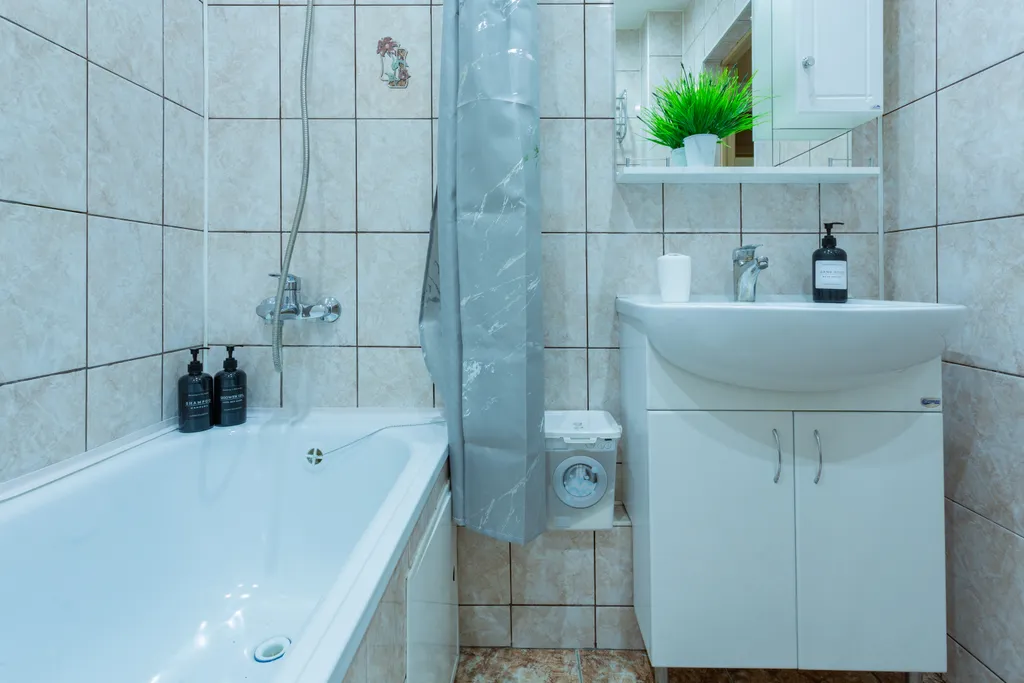 Санузел: средства личной гигиены, полотенца, фен, стиральная машина, водонагреватель.