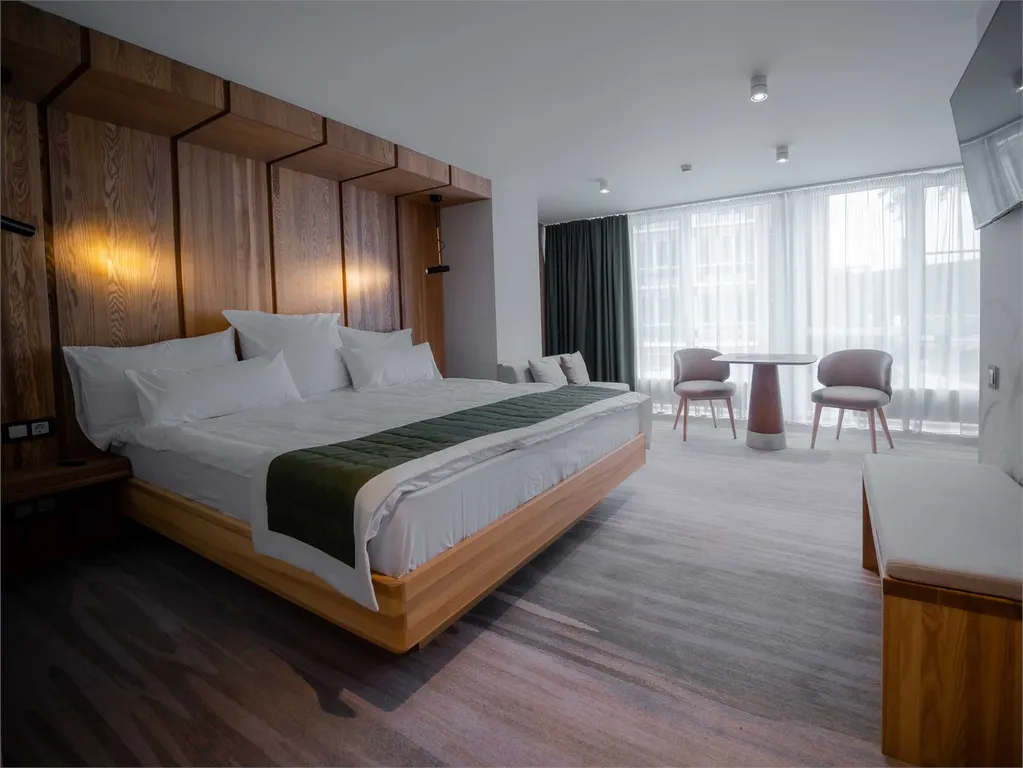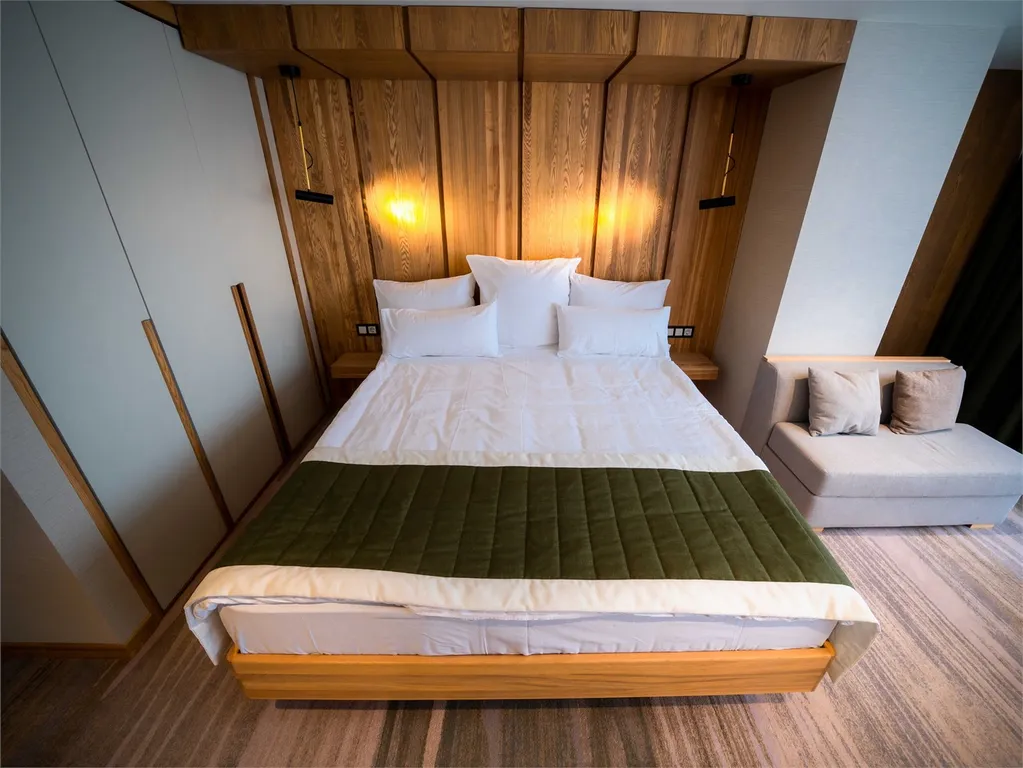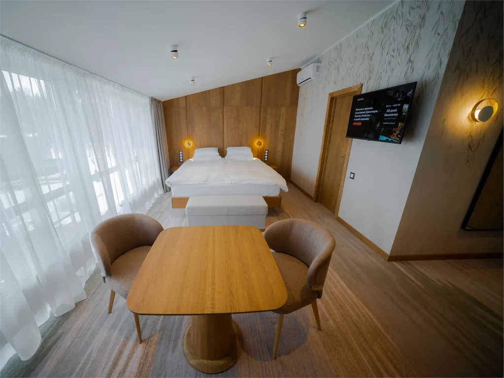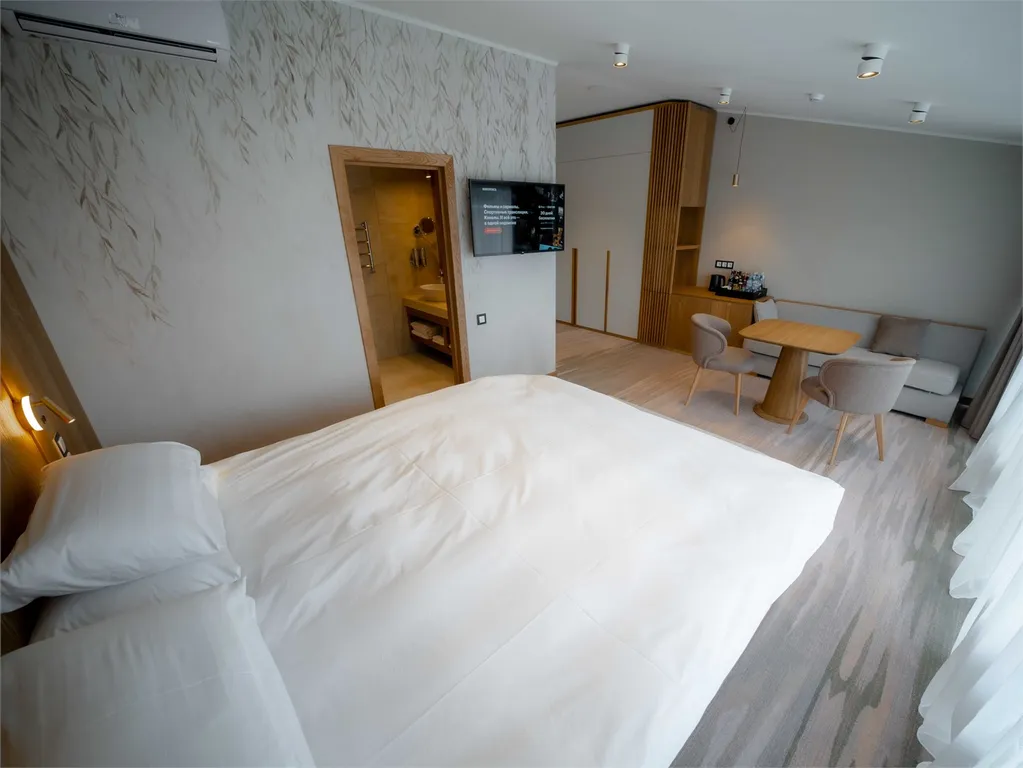 Номера общей площадью 30 м2 имеют одну двуспальную кровать размера king-size и будут комфортными для размещения двух человек, с возможностью организации дополнительных спальных мест. Грамотное зонирование номеров данной категории включает спальную зону, возможность организации рабочего пространства и зону для отдыха и расслабления. Роскошный текстиль и постельные принадлежности позволят насладиться каждым мгновением.