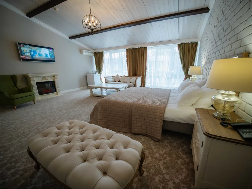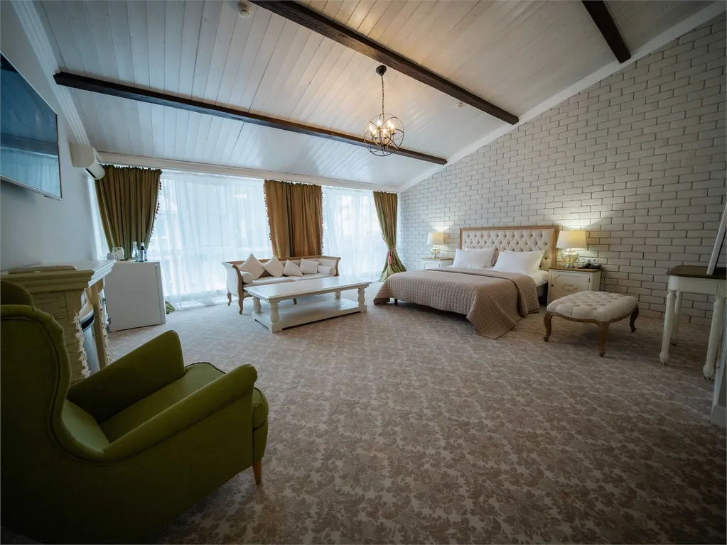 Номер категории luxe - общая площадь 40 м2. Стильная мебель и декоративные предметы интерьера гостиной создают неповторимую атмосферу в сочетании с дымчатым дубом, стеклом и светлым кирпичом. Пространство гостиной удачно разделено на комфортную зону отдыха и спальную зону. В спальной зоне номера – большая двуспальная кровать с роскошными постельными принадлежностями.