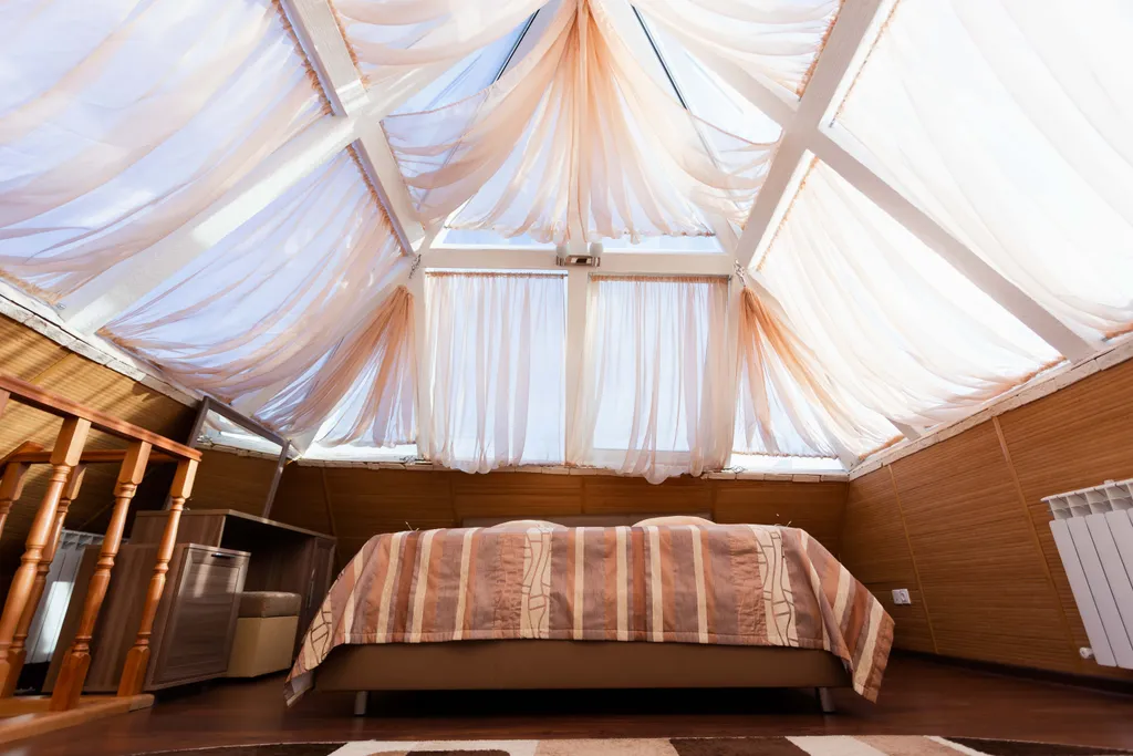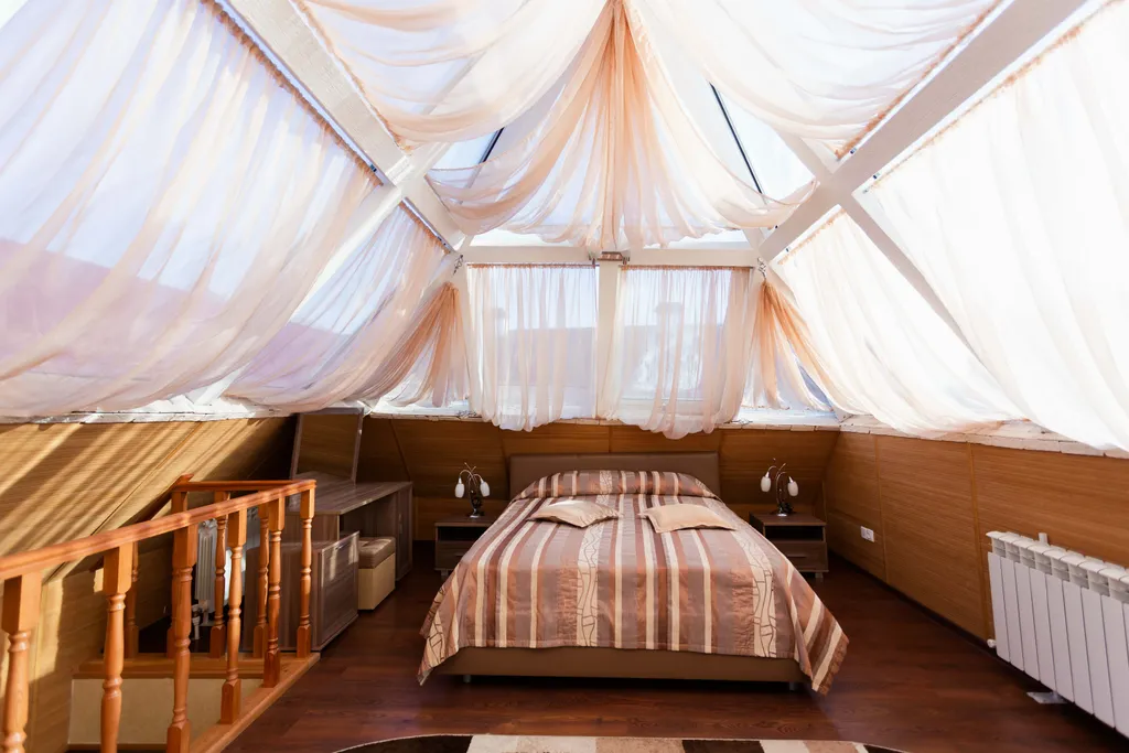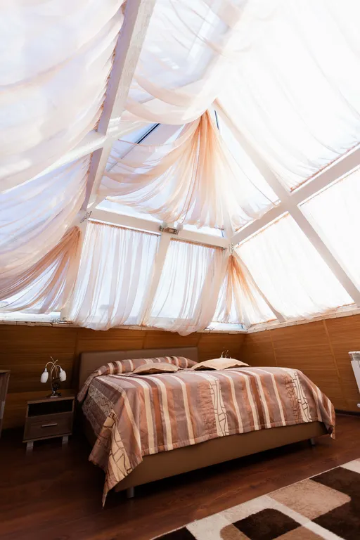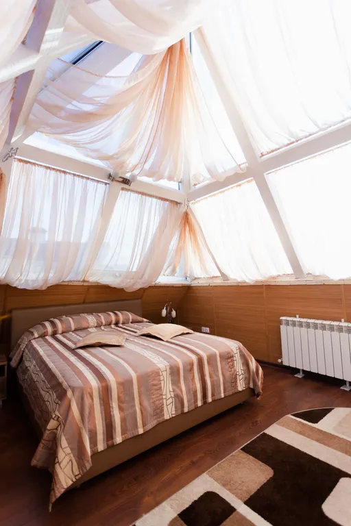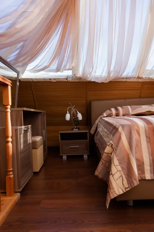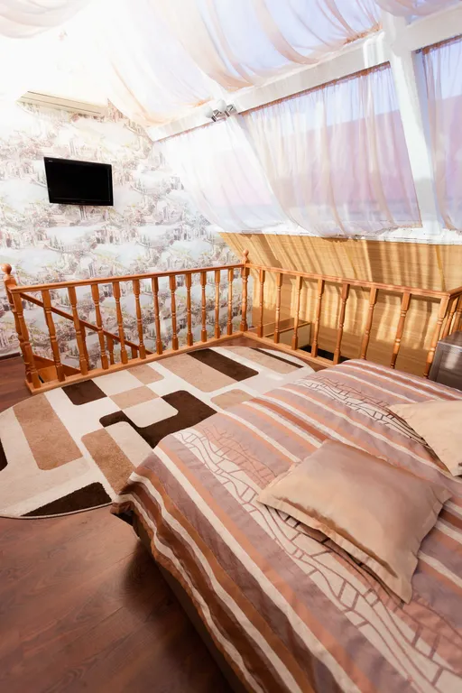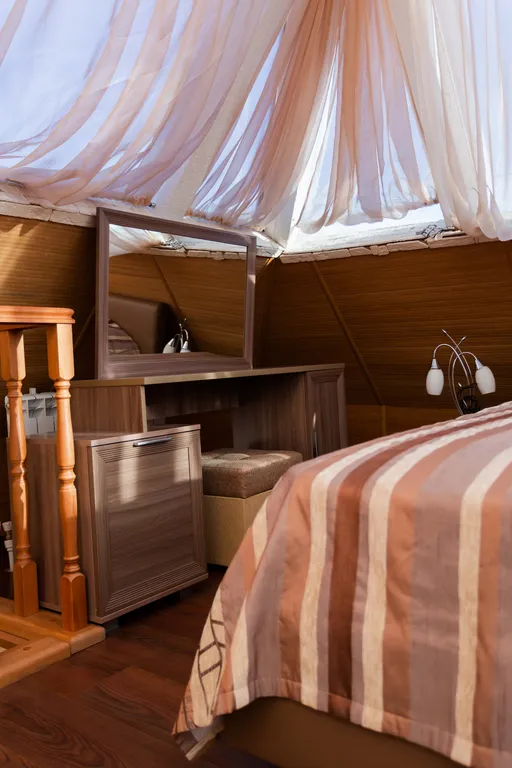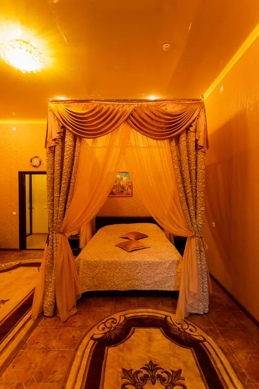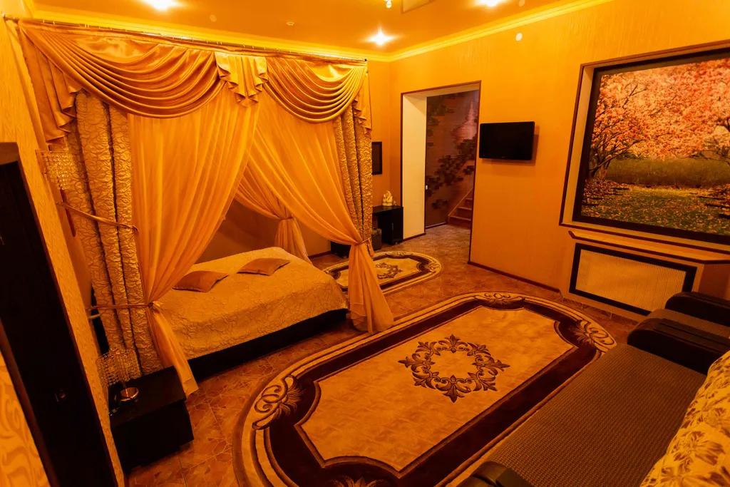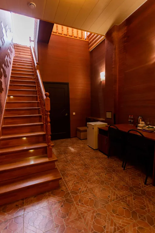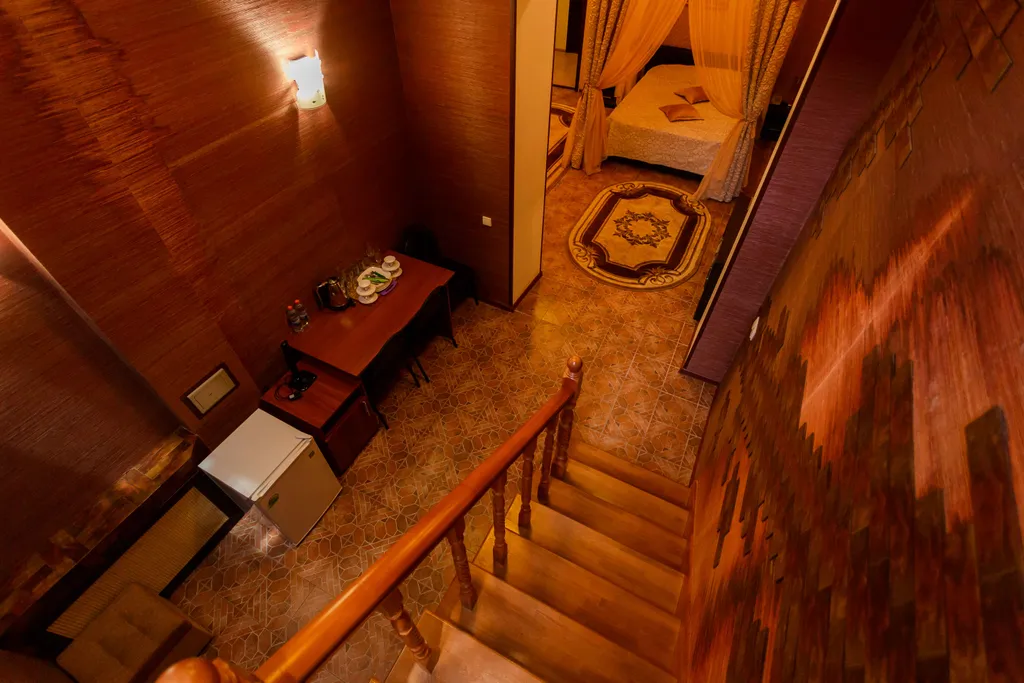 Престижный двухэтажный люкс. На первом этаже - широкая двуспальная кровать, жк телевизор, женский столик с пуфиком, джакузи для двоих, мини-холодильник, халаты, сменная обувь. На второй этаж ведет красивая лестница с подсветкой. На втором этаже под стеклянным куполом крыши - двуспальная кровать, дамский столик, бра, кондиционер, жк телевизор. Номер прекрасно подходит, как для отдыха семьи или пары, так и для деловых людей.